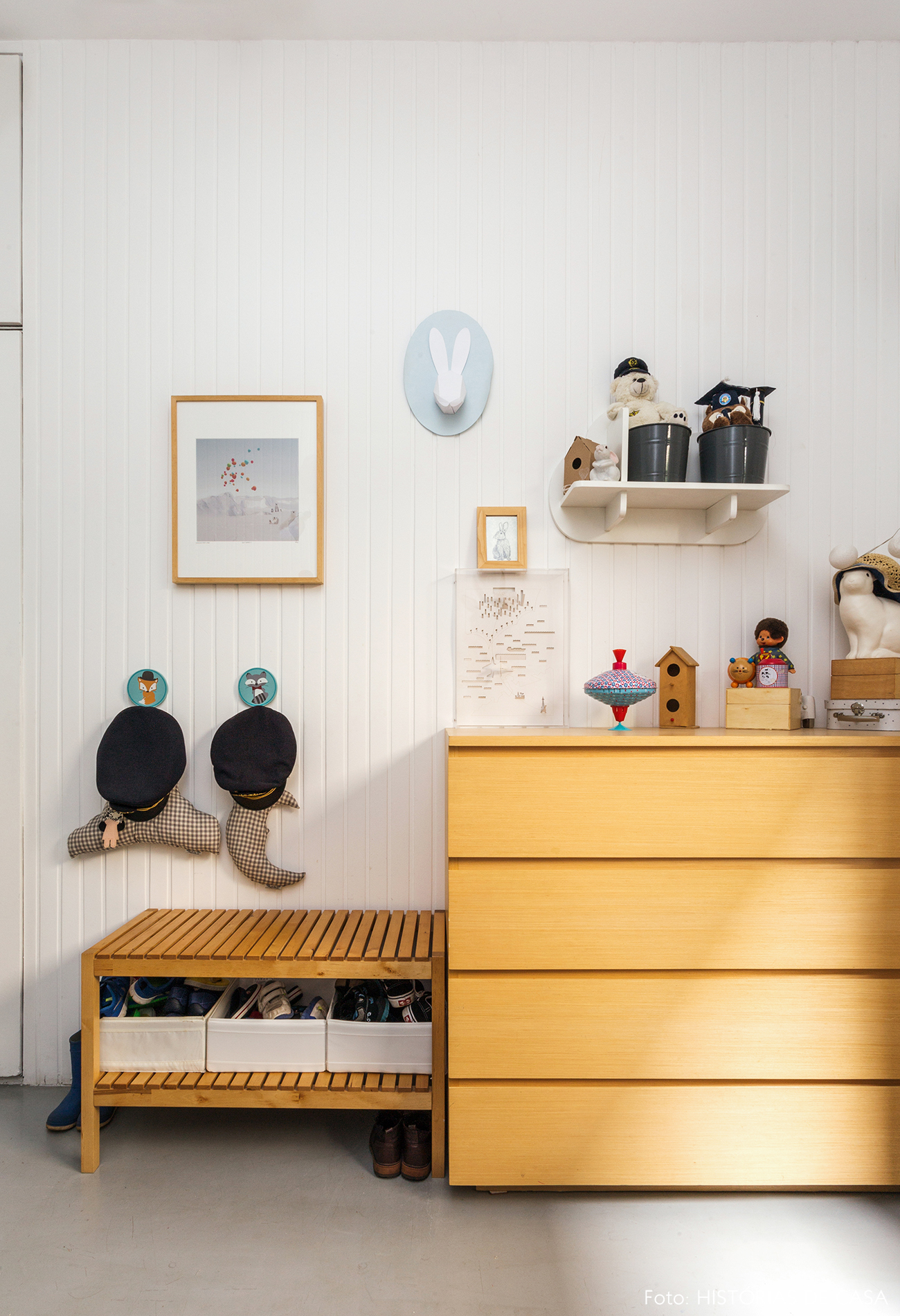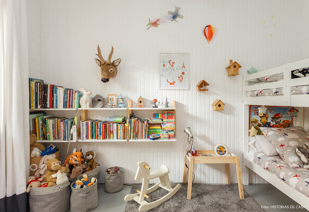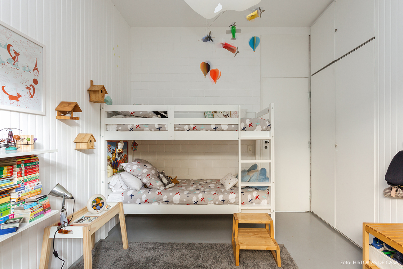 O quarto de Marcel e Georges tem um beliche para os dois irmãos e diferentes texturas nas paredes. Cécile diz que a infância é o melhor momento da vida, por isso os espaços infantis podem ter seu quê lúdico. “Tentamos fazer um quarto “algodão doce” sem exagero! Com muitos livros em francês e português, animais de pelúcia e algumas nuvens e aviões, para que eles possam ter sonhos maravilhosos”, ela diz. Na sala de brinquedos, estantes baixas e cestos ajudam a manter tudo em ordem após as brincadeiras da criançada.