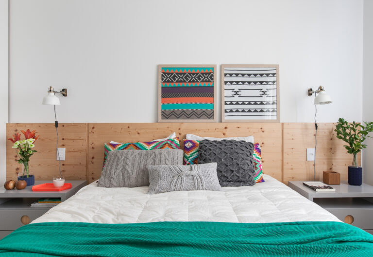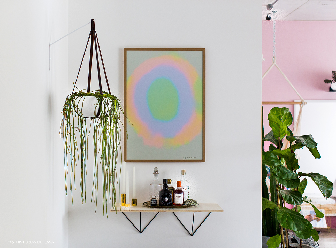 “Eu me identifico muito com o conceito do estilo escandinavo, que entende um ‘ambiente aconchegante’ como um lugar amplo, com bastante elementos claros para refletir a luz natural, móveis de linhas simples feitos de materiais mais rústicos, alguma textura suave, poucas cores e estas mais sóbrias, e sempre procurando simplicidade e funcionalidade para cada objeto. Tentei imprimir esse estilo adaptando-o à cidade de São Paulo – que de escandinava não tem nada”, Julia brinca. Talvez justamente por viver em uma cidade tão agitada, a designer tenha buscado uma casa que transmita tranquilidade e que a acolha bem ao final do dia, com velas trazendo uma luzinha boa, muitas plantas e suas cores favoritas.