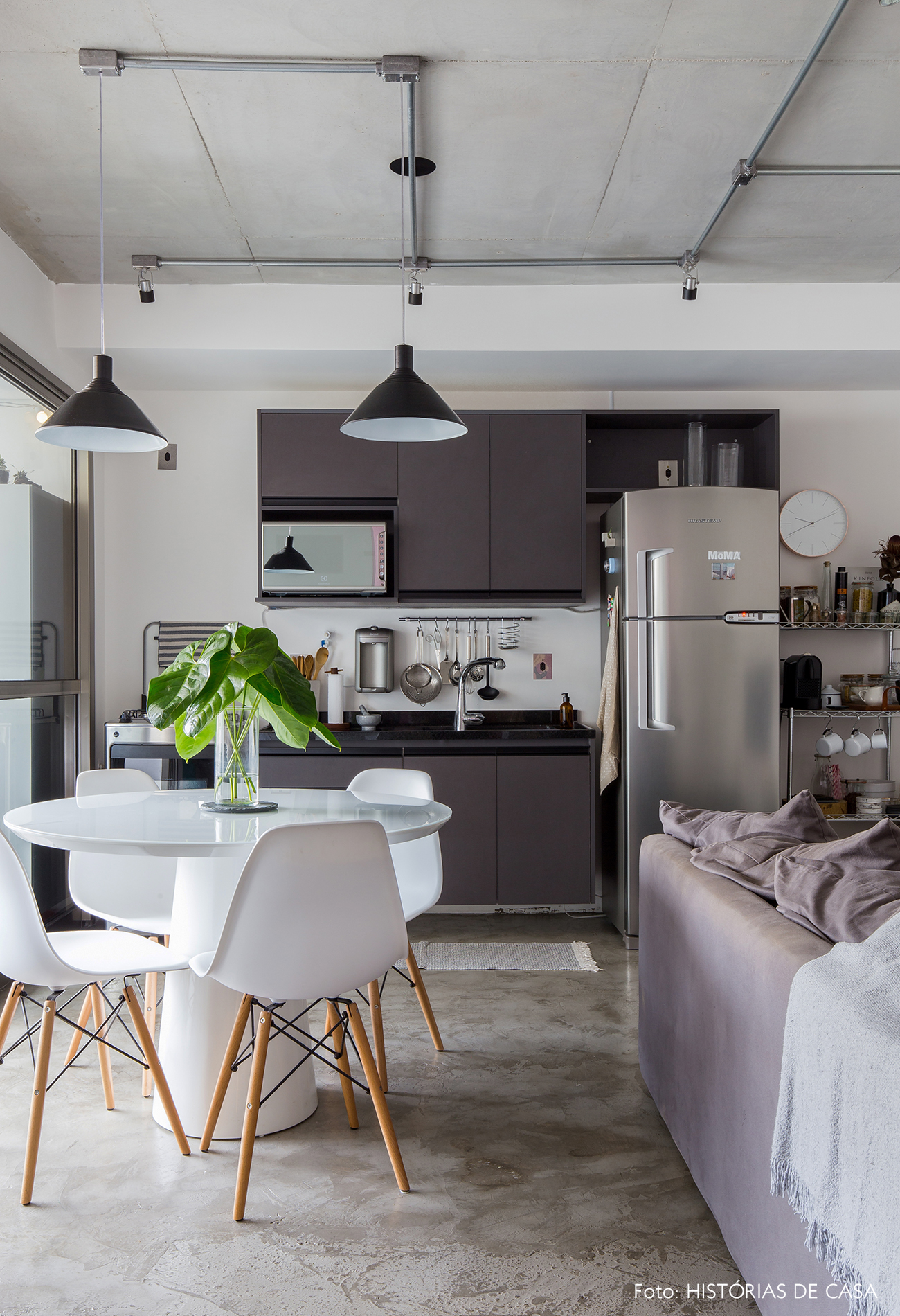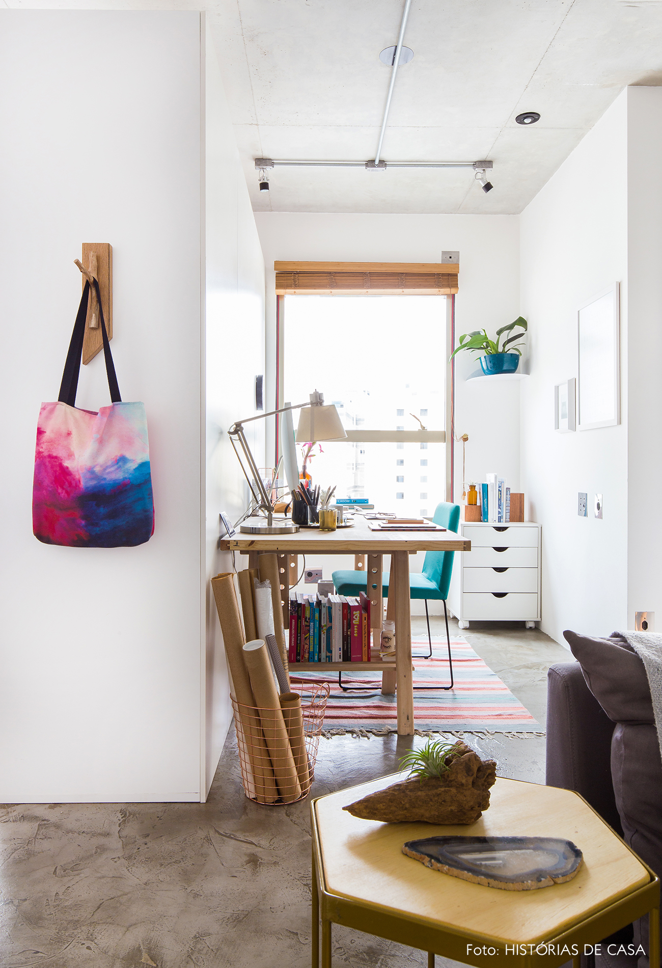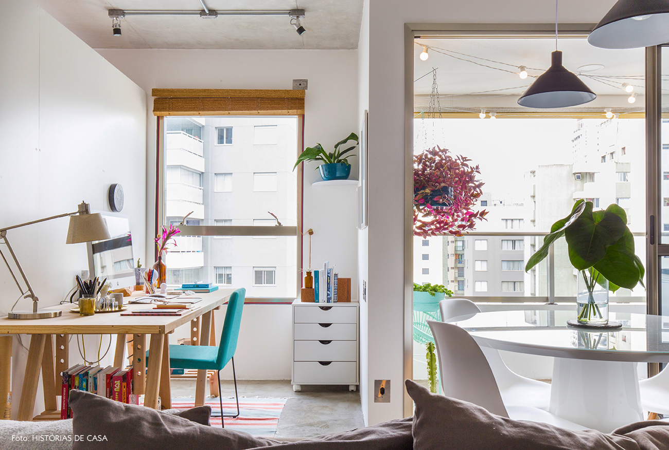 De fato, ela enxergou o apê como uma tela em branco, onde poderia montar os espaços e dispor os móveis da maneira que melhor funcionasse em seu dia a dia. Sem divisórias fixas atrapalhando a circulação, o imóvel de 53m² pôde ser moldado de acordo com as necessidades de Julia. O home office e o quarto, por exemplo, foram delimitados com a ajuda de um guarda-roupa, mas no futuro essa peça pode ser deslocada se preciso. A área foi tão bem aproveitada que o apartamento não parece pequeno e de quebra tem uma varanda muito confortável.