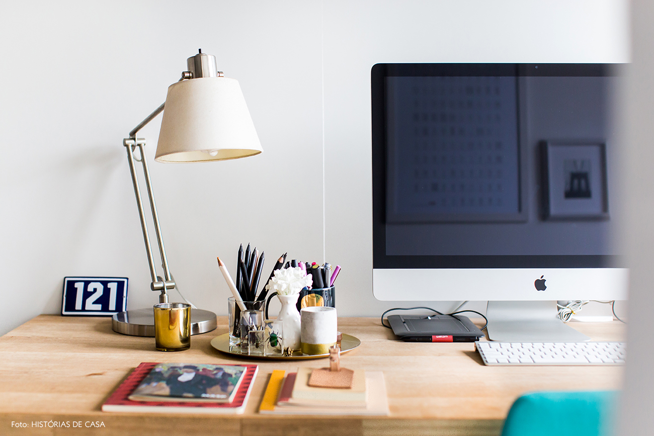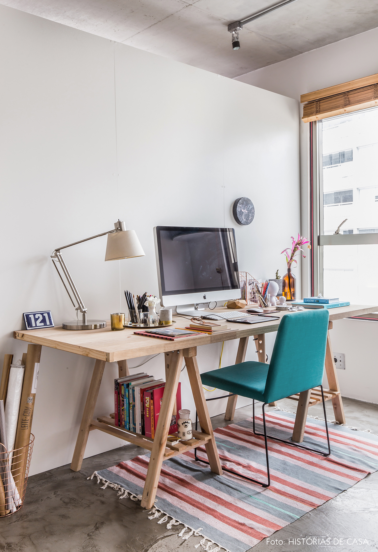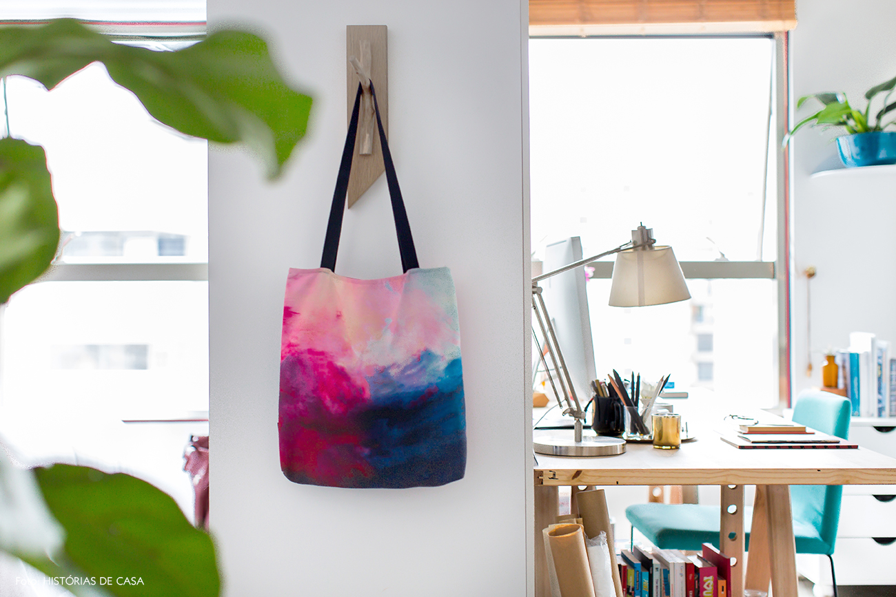 Julia queria móveis de madeira clara, que traduzissem essa sensação de acolhimento, mas não estava encontrando peças como imaginava, então ela acabou montando sozinha algumas coisas, como o bar com mão-francesa e a mesa de cavaletes do escritório. “Eu até cheguei a pesquisar móveis já prontos, mas nunca achava nada do jeito que queria, então decidi garimpar os materiais separadamente. Demorou um pouco mais para encontrar as peças certas, mas no final fiquei feliz com o resultado e consegui economizar bastante”, ela diz.