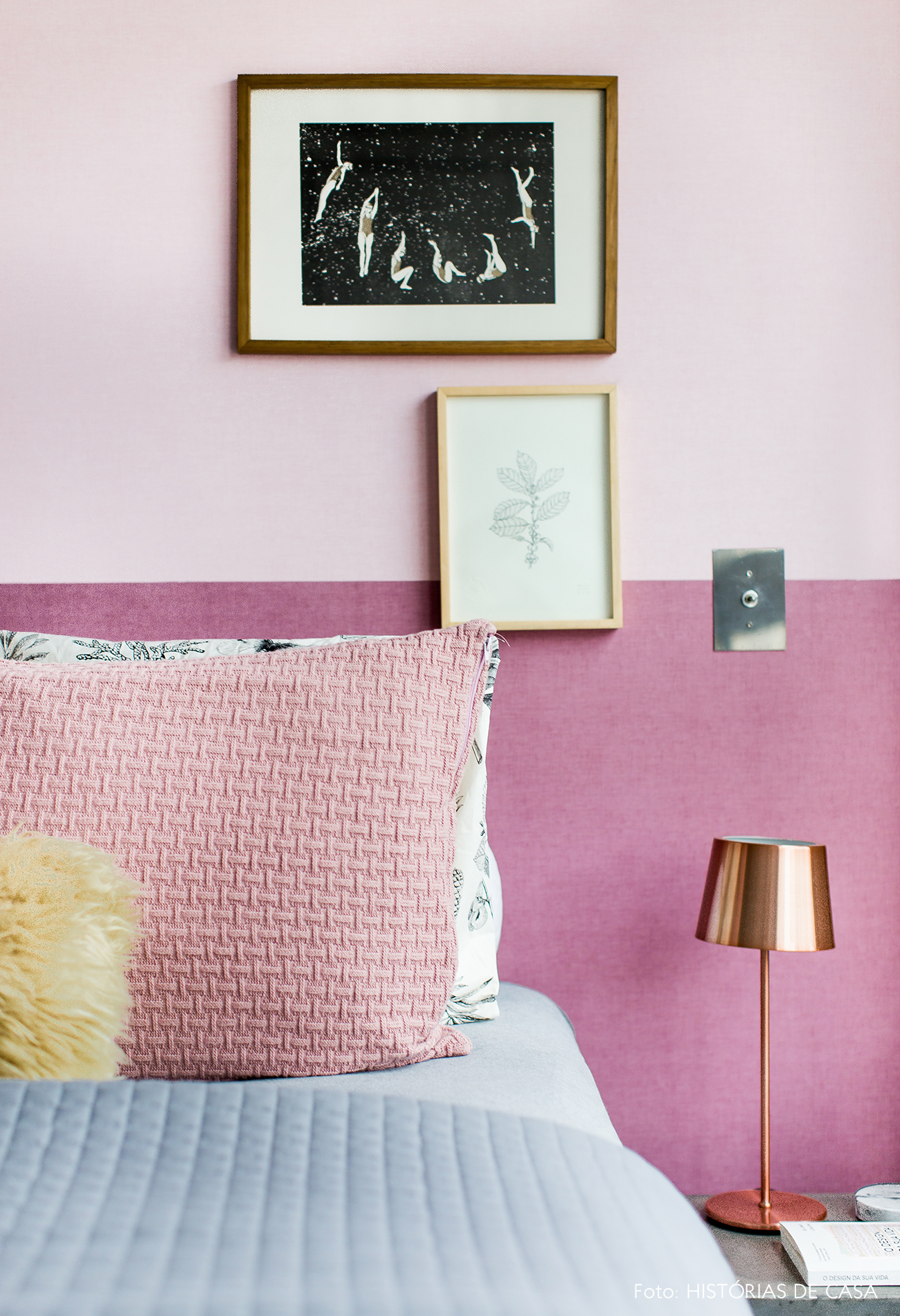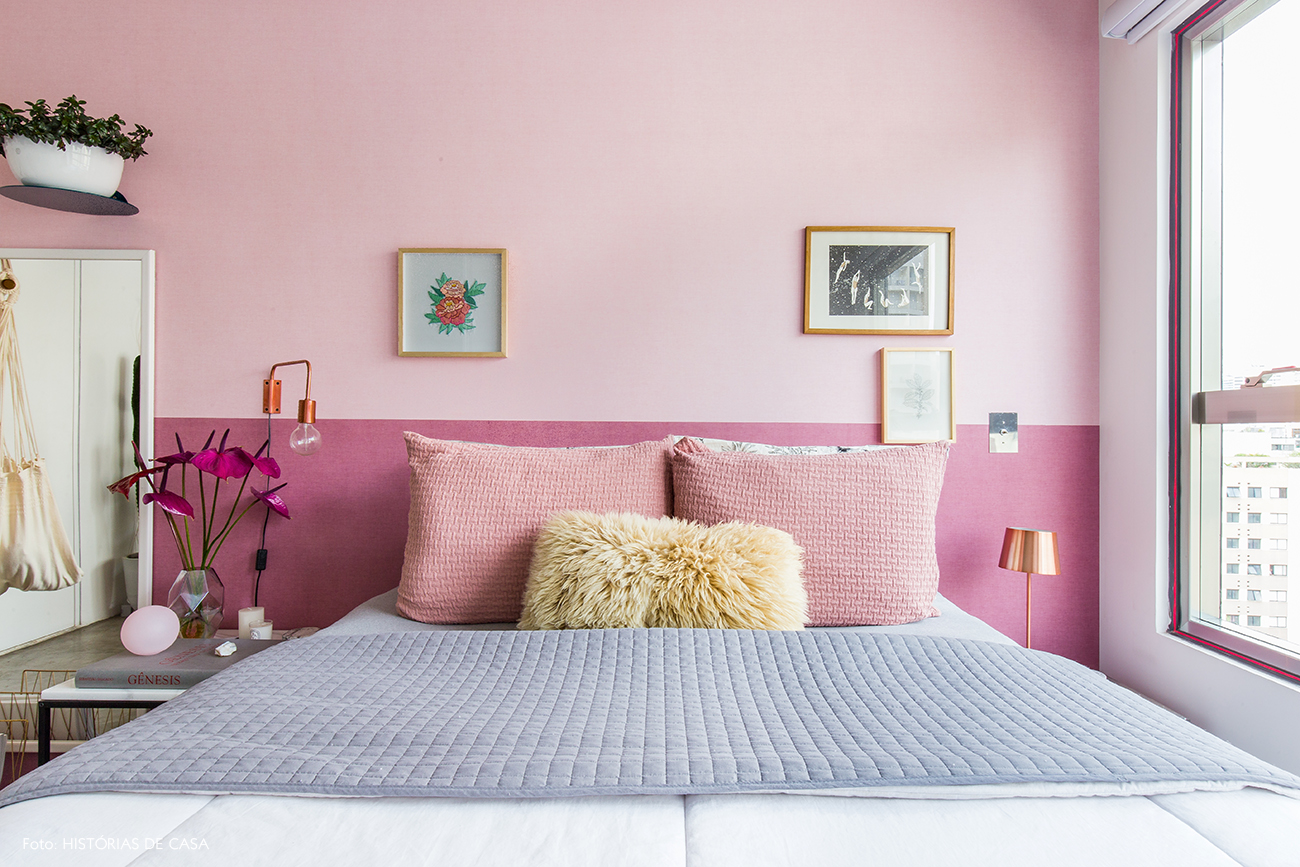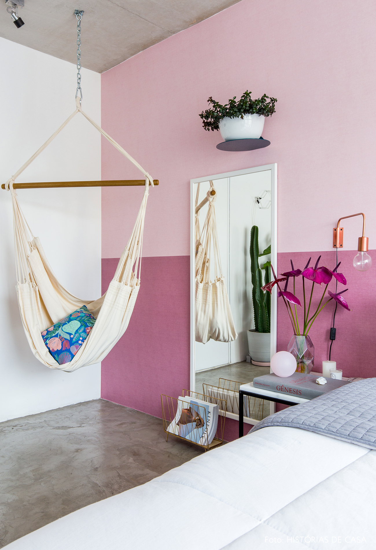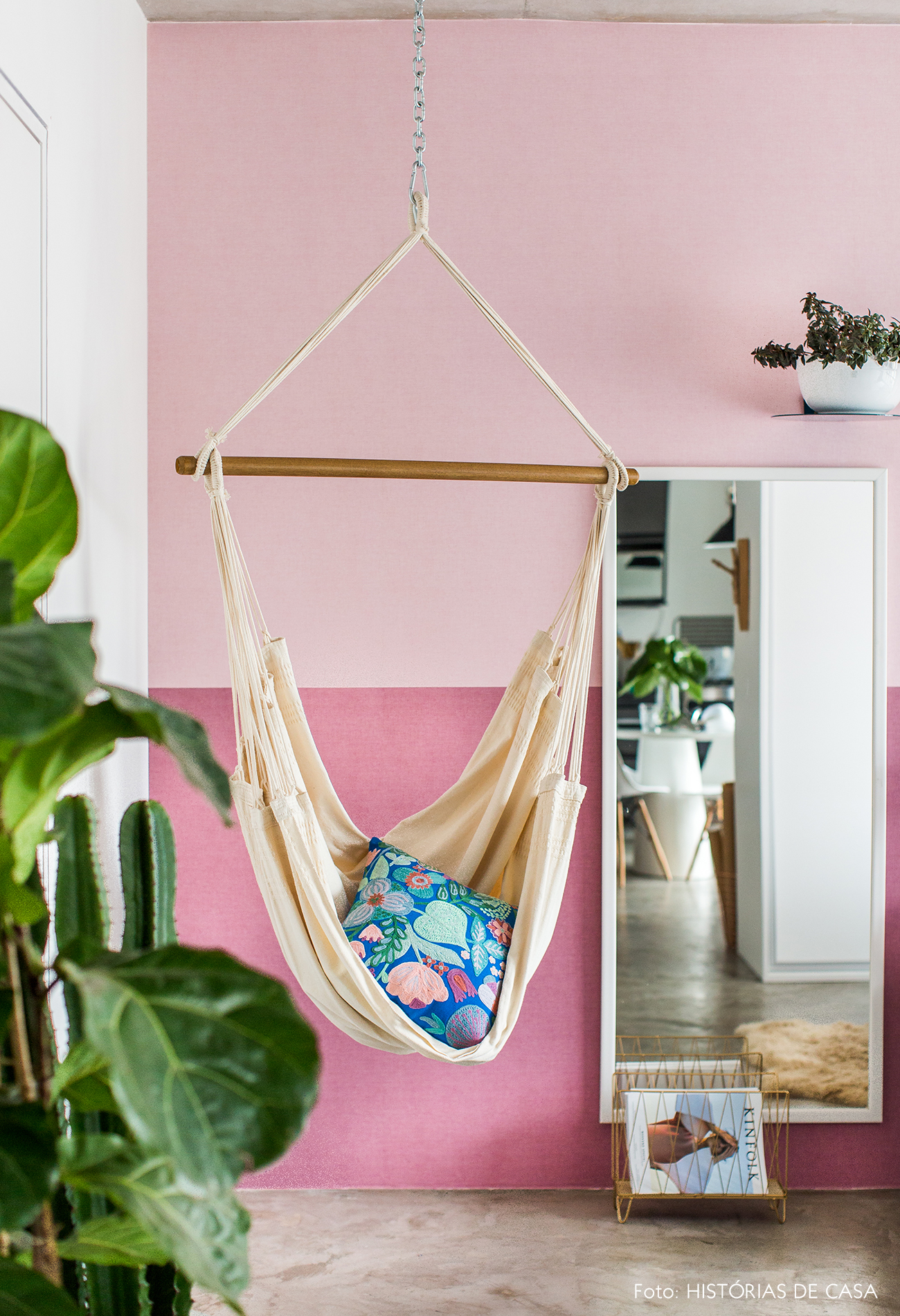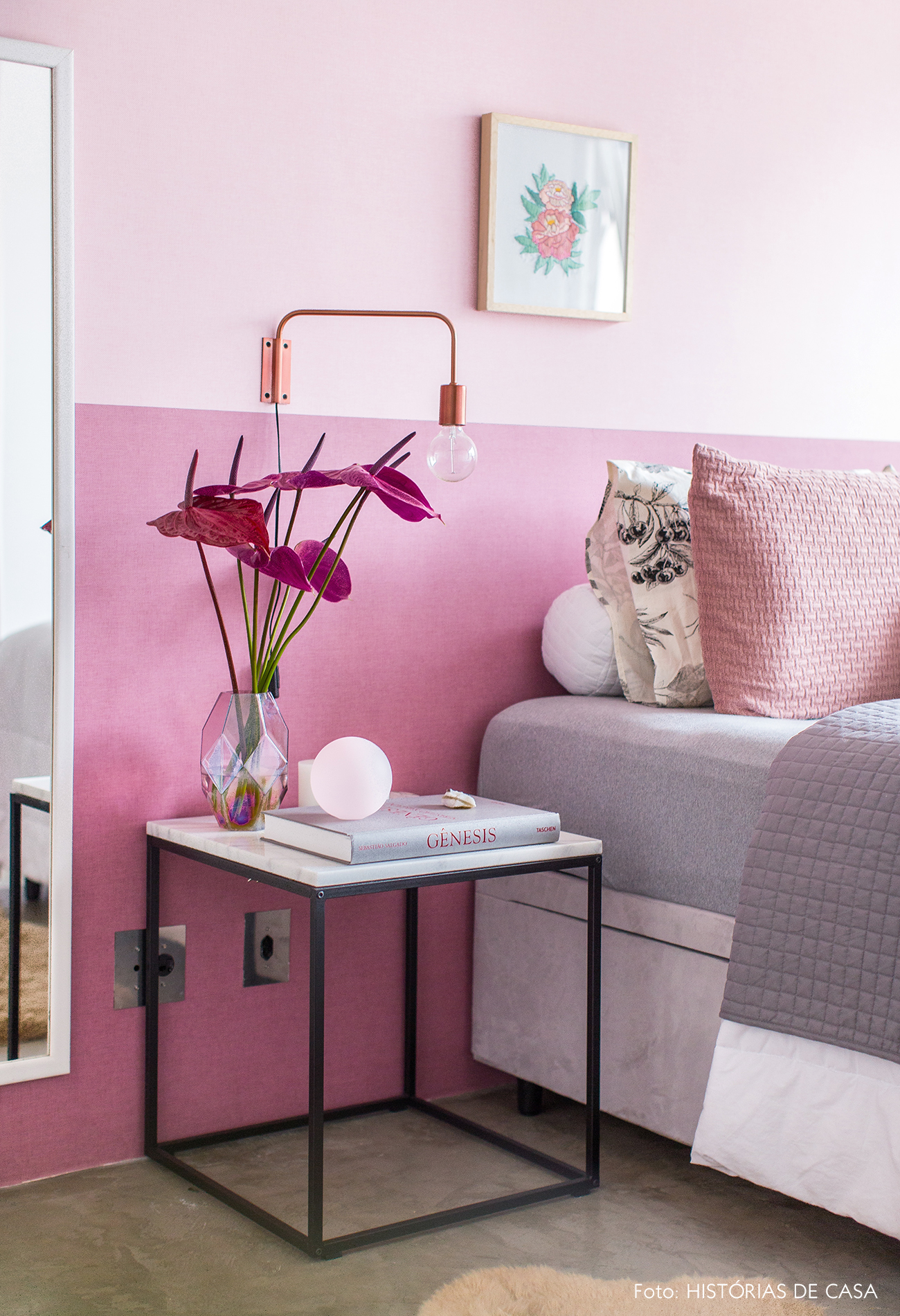 Um dos destaques do apartamento é a parede do quarto, revestida com uma dupla de papéis de parede de linho da marca branco. papel de parede. A moradora viu essa composição online e gostou bastante, então decidiu ousar e a aplicou na área atrás da cama. “O papel de parede com certeza deu o acabamento que o quarto estava precisando. Antes dele, era apenas mais uma parede branca que não conseguia causar o impacto de hoje. Agora o papel é a primeira coisa que se vê ao abrir a porta. E o mais lindo é que no fim do dia, quando o sol está se pondo, por apenas alguns minutos, entra uma luz laranja pela janela e, em conjunto com o rosa, cria-se um brilho único no apê inteiro. É meu momento favorito do dia dentro de casa”, ela conta.