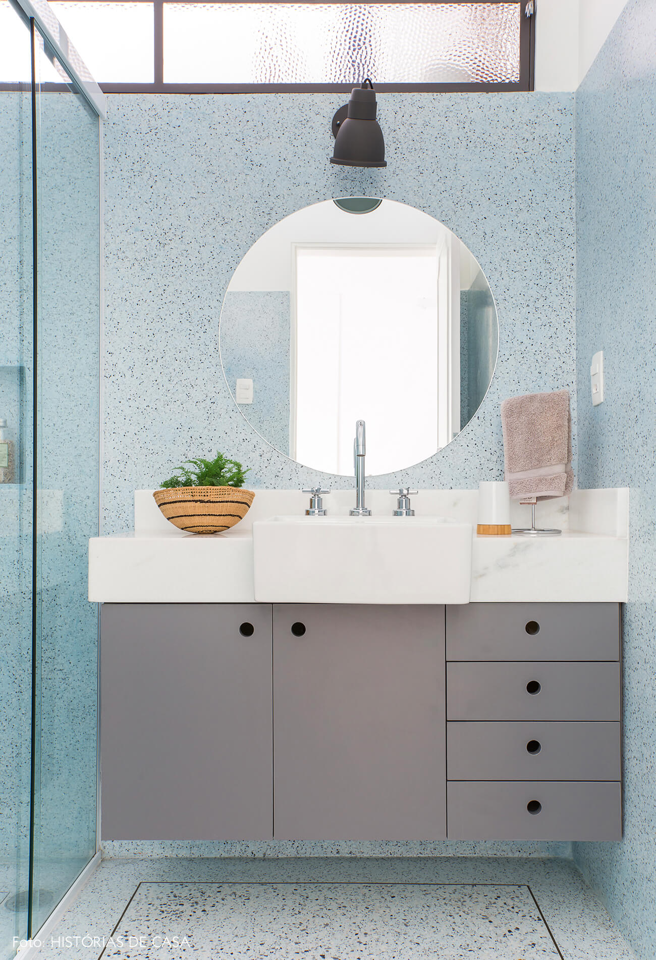 O banheiro azul é o primeiro de três ambientes decorados com granilite em tons diferentes. A cor é uma das preferidas do casal e o material é tão apaixonante que acabou sendo usado também nas paredes. Esse cômodo foi diminuído durante a obra para dar lugar a uma varanda aberta para a cozinha, e se tornou ainda mais acolhedor. * Ficou curioso para conferir o restante dos espaços e descobrir todos os segredos do apê? Então não perca o Capítulo 2 dessa história aqui no blog!