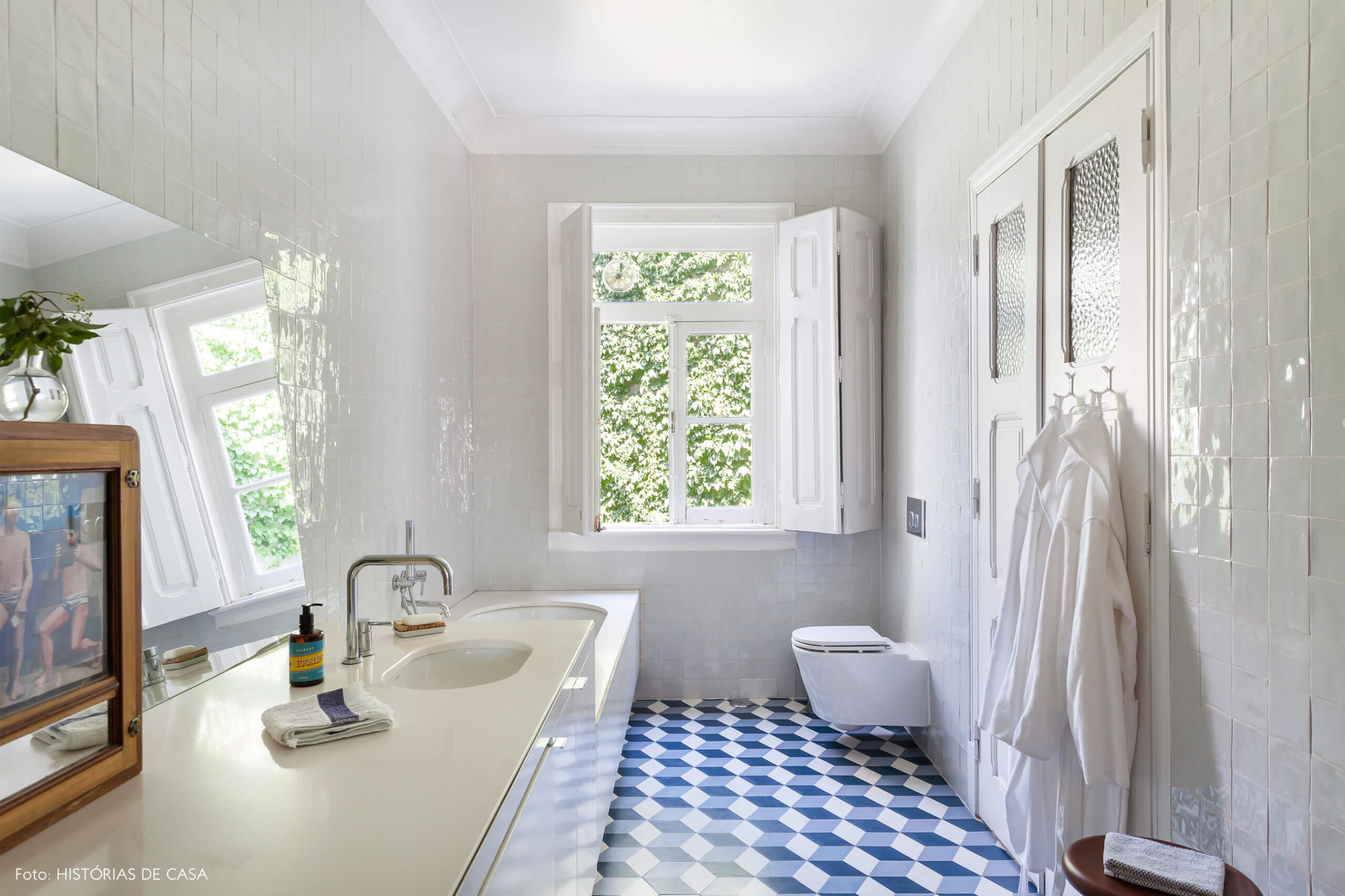 O banheiro é um dos ambientes favoritos do casal, e não é difícil de entender o porquê. Além de ser bem espaçoso, o cômodo tem uma grande janela que se abre para o verde. Peter conta que a luz reflete nos azulejos clarinhos e torna cada hora do dia muito especial. Na arquitetura, detalhes originais da construção foram preservados mesmo após a reforma, como a porta dupla de madeira e vidro ou a moldura de gesso no teto. O piso de ladrilhos hidráulicos geométricos e as louças novas ajudam a modernizar a decoração na dose certa.