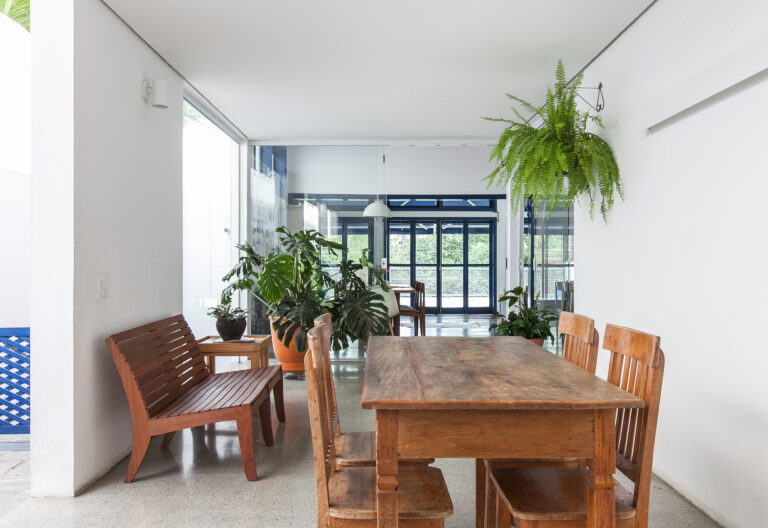 As mudanças na construção antiga foram comandadas pelo arquiteto Luiz Gustavo Sobral Fernandes, do escritório Meridional Arquitetura, como a escolha das cores espalhadas pela casa, a troca de acabamentos, o paisagismo, a iluminação e a marcenaria, incluindo o projeto do armário do quarto – que fica no mezanino. Quando Nikolas alugou o imóvel, ele já não precisava de alterações, então o próximo passo foi habitar o espaço. Para isso, os móveis e objetos de Nikolas vindos de suas casas anteriores entraram em cena. “Houve uma seleção de peças, pois sempre vivi em locais maiores. Isso me levou a escolher realmente quais iriam ficar e quais teriam que ir embora”, o morador lembra.