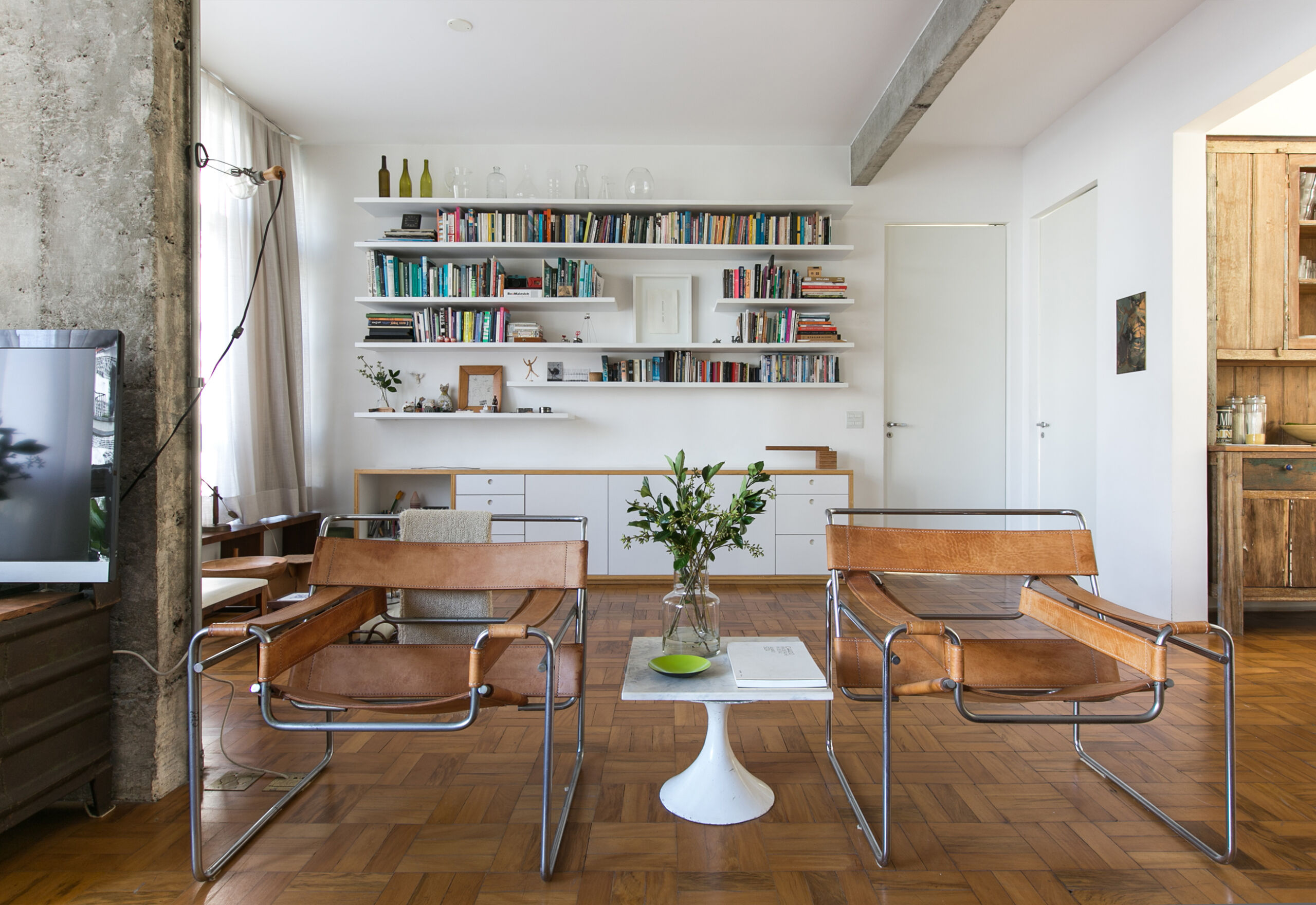 Tons neutros e texturas rústicas em um apê acolhedor